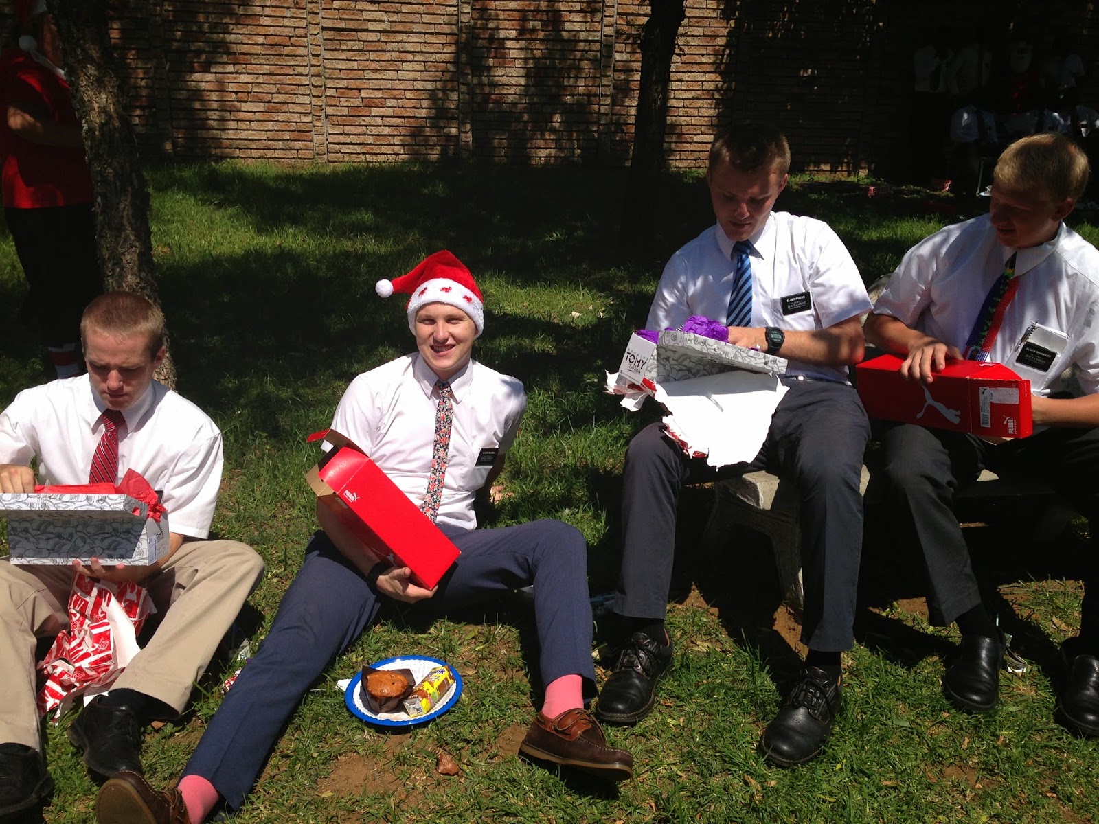 Christmas Day in Johannesburg was warm and sunny, not a snowflake in sight, and even though it did not quite feel like Christmas, we had a great time helping to prepare and serving breakfast to about 170 missionaries here in the Johannesburg Mission. The mission president and his wife and all of their Christmas "helpers" worked hard to make the breakfast, the fireside and the Christmas gifts special for the Elders. They are all so far away from home and this year, and because of the mail strike, they weren't able to get packages from their families. Generous members and even non-members in the Johannesburg area baked, gathered gift donations and contributed funds so that a gift box could be given to each Elder. After breakfast, we had a nice fireside which included the first-in-Africa showing of "Meet the Mormons." The film was really well done and did a great job of introducing the church as the world wide church that it has become. After the breakfast and fireside, the Elders changed into their P-day clothes and were free to hangout and play games until they had to go home so that they could make their Christmas day call to their families. In the evening, we had dinner with a South African family here which was also very nice and included a gift exchange afterwards. Unfortunately, I neglected to take any pictures of the event.